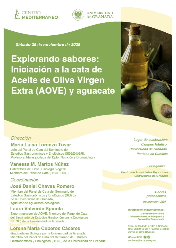 10:30-12:30 | Fundamentos de la Nutrición Humana y beneficios de la Dieta Mediterránea. Cata de AOVE: calidad y propiedades saludables. Vanessa Martos, Mª Luisa Lorenzo Tovar y Laura Valverde. |