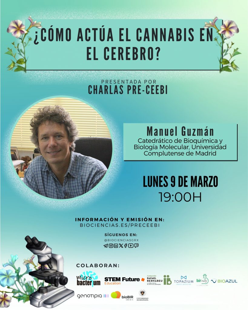 Esta charla pre-CEEBI tendrá lugar el 09 de marzo de 2026 a las 19:00. Podrás disfrutar de Manuel Guzmán, catedrático de la Universidad Complutense de Madrid, y su charla «¿Cómo actúa el cannabis en el cerebro?».