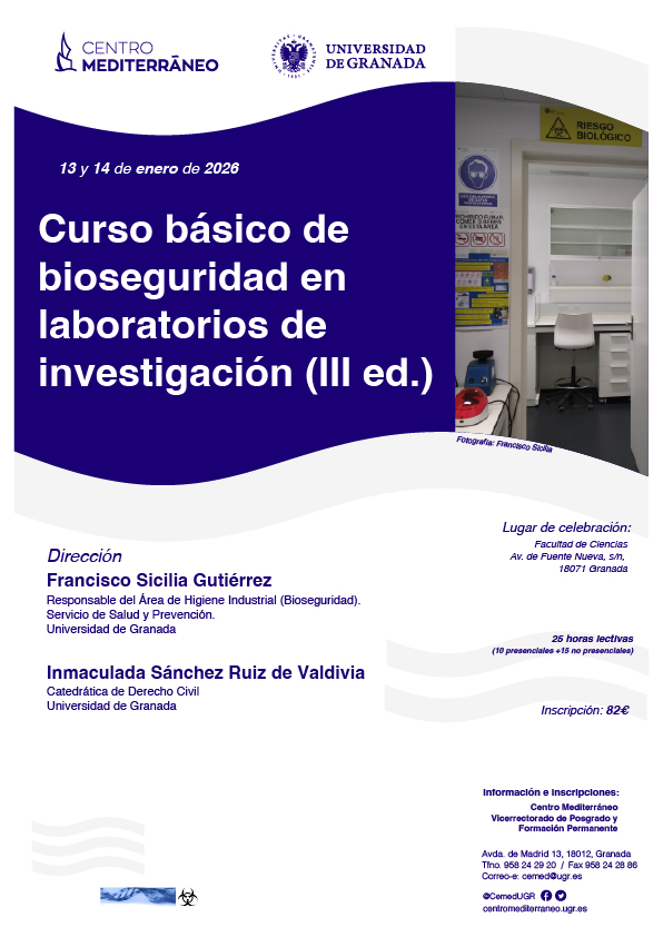 16:00-21:00 | Tema 1: Legislación nacional e internacional en materia de riesgo Biológico (Ley de Prevención de Riesgos Laborales 31/1995, Real Decreto Protección contra riesgos Biológicos, RD664/97, Ley 9/2003 de Organismos Modificados Genéticamente, Real Decreto de utilización de OMGs, RD 178/2004). Tema 2: Medidas de contención en Laboratorios de NIVEL DE CONTENCIÓN BIOLÓGICA 1, 2 Y 3. NCB1, NCB2 Y NCB3. Tema 3: Cabinas de Seguridad Biológica: tipos, instalación y Buenas prácticas en el uso. Tema 4: Equipos de Protección Individual (EPI). Mascarillas, guantes, batas,… Elección, uso y segregación. Taller práctico sobre “Poner y quitar EPIs”. Docente: Francisco Sicilia Gutiérrez. Responsable del Área de Higiene Industrial. Servicio de Salud y Prevención. UGR |