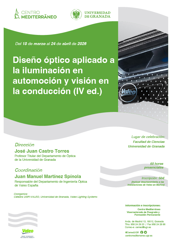 | 16:30-18:30 | Presentación del curso. Iluminación de vehículos: complejidad y necesidad. José Juan Castro Torres, Profesor Titular del Departamento de Óptica de la Universidad de Granada y Director académico del curso, Juan Manuel Martínez Spínola, Responsable del Departamento de Ingeniería Óptica de VALEO España y Coordinador del curso |