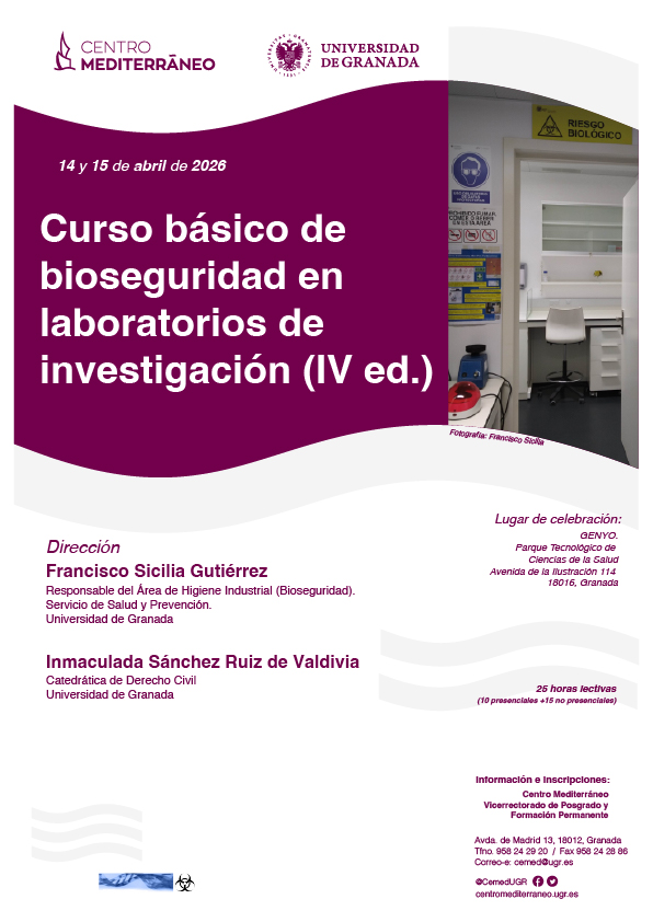 Tema 1: Legislación nacional e internacional en materia de riesgo Biológico (Ley de Prevención de Riesgos Laborales 31/1995, Real Decreto Protección contra riesgos Biológicos, RD664/97, Ley 9/2003 de Organismos Modificados Genéticamente, Real Decreto de utilización de OMGs, RD 178/2004). Tema 2: Medidas de contención en Laboratorios de NIVEL DE CONTENCIÓN BIOLÓGICA 1, 2 Y 3. NCB1, NCB2 Y NCB3. Tema 3: Cabinas de Seguridad Biológica: tipos, instalación y Buenas prácticas en el uso. Tema 4: Equipos de Protección Individual (EPI). Mascarillas, guantes, batas,… Elección, uso y segregación. Taller práctico sobre “Poner y quitar EPIs”. Docente: Francisco Sicilia Gutiérrez. Responsable del Área de Higiene Industrial. Servicio de Salud y Prevención. UGR |